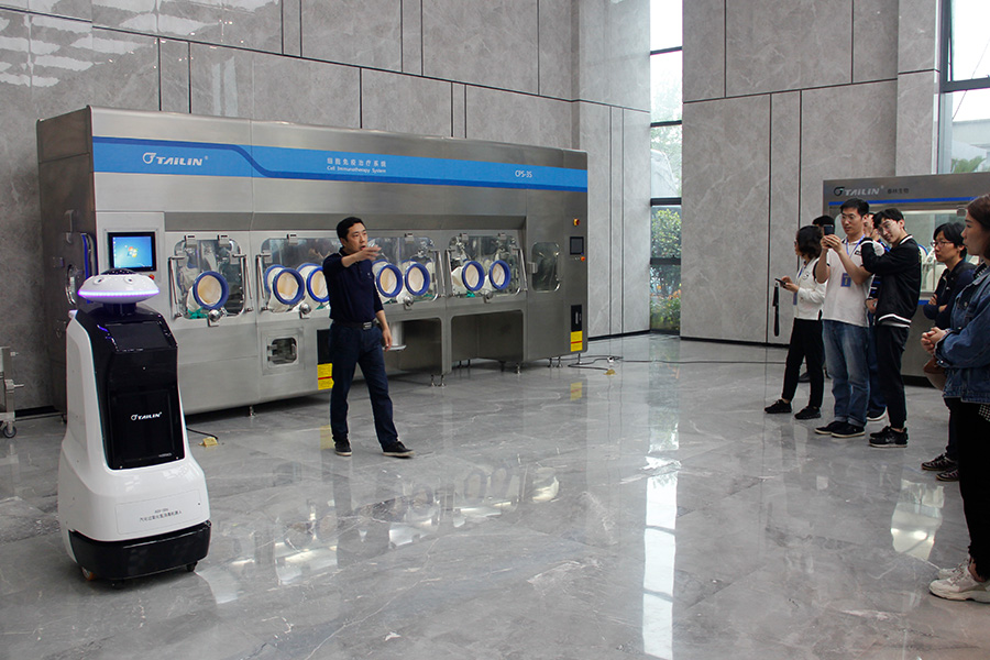 泰林生物副總經理夏信群向各位領導、專家們介紹正在自動行走的滅菌機器人,以及應用于CAR-T細胞治療的細胞治療工作站。